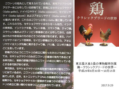 食と農の博物館では鶏について特別企画の展示がしてありましたので、セミナーの始まる前に観てきましたが、鶏の原種と世界の鶏の剥製(はくせい)標本が展示されていて、こんなに変異があるのかと驚きました。日本の鶏は同博物館の2階に常設展示されていますが、オナガドリやチャボなど珍しい鶏の剥製標本があります。さすが東京農業大学らしい、素晴らしい企画だと思いました。