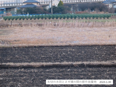 矢切の農耕地の間を流れる坂川には羽の中に頭を埋めたホシハジロの♀が浮かんでいました。やきりばしの下には今でもホームレスの住居があります。他の橋はホームレスが住み着かないように垣根でブロックされていました。やきりばしの上には今まで見たことがない野鳥がいて、ハクセキレイを追い払っていました。イソヒヨドリという鳥のようでした。空には珍しい雲が展開していて、夕焼けの中に東京スカイツリーが見えました。ネギ畑で土寄せ作業をしている農家と、水田で田起こし作業をしている農家がいました。